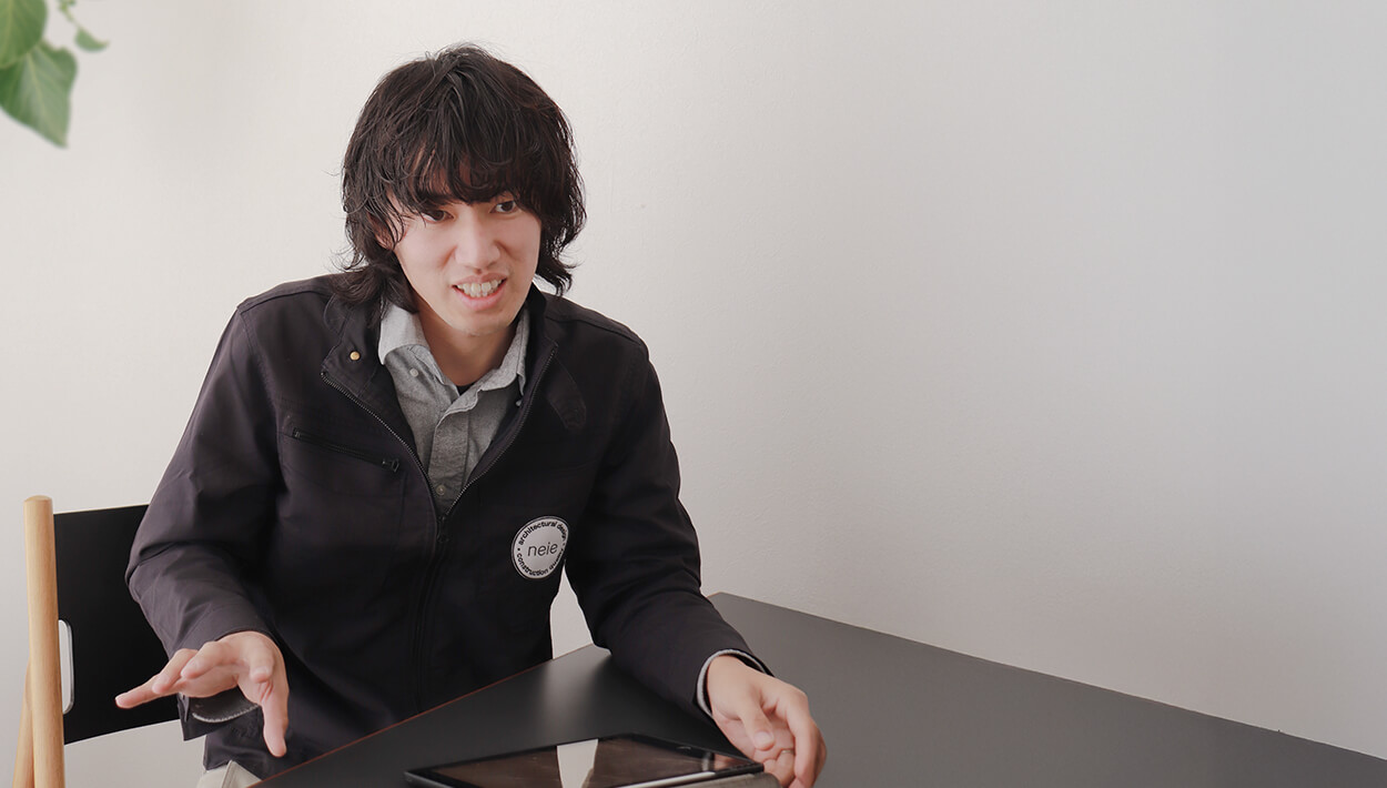 前職では全国規模で公共建築を手掛ける施工監督として働いていましたが、学生時代から住宅建築に興味があり、とくに木造住宅の現場で経験を積みたいと考えていました。そんな時に出会ったのが、ネイエです。手掛ける家の世界観に惹かれたのはもちろん、設計から施工、メンテナンスまで一貫して行う家づくりに共感し、入社を決めました。